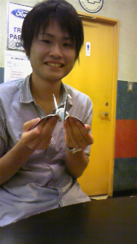 写真は初登場・ネクラポップのドラムを叩いてくれている星くんと折り鶴です。折り紙上手な星くんが鶴を折ってくれました。とっても美しい。俺が折る鶴の何倍ものクオリティーです。この鶴、ネクラポップと何の関係があるかはきっとライブに来てくだされば分かっていただける…かも(笑)何だか商業的なテキストですみません。