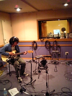 写真はギターを重ねて録る五島さん。集中中です。何か日本語が変になった。